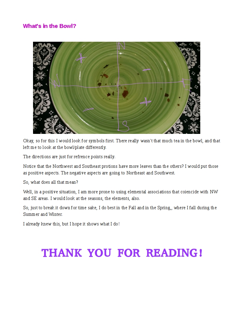 I drink a cup of coffee or tea, your choice, meditate on your question, and give you advice on where to go next. I have a sample reading pictured too!